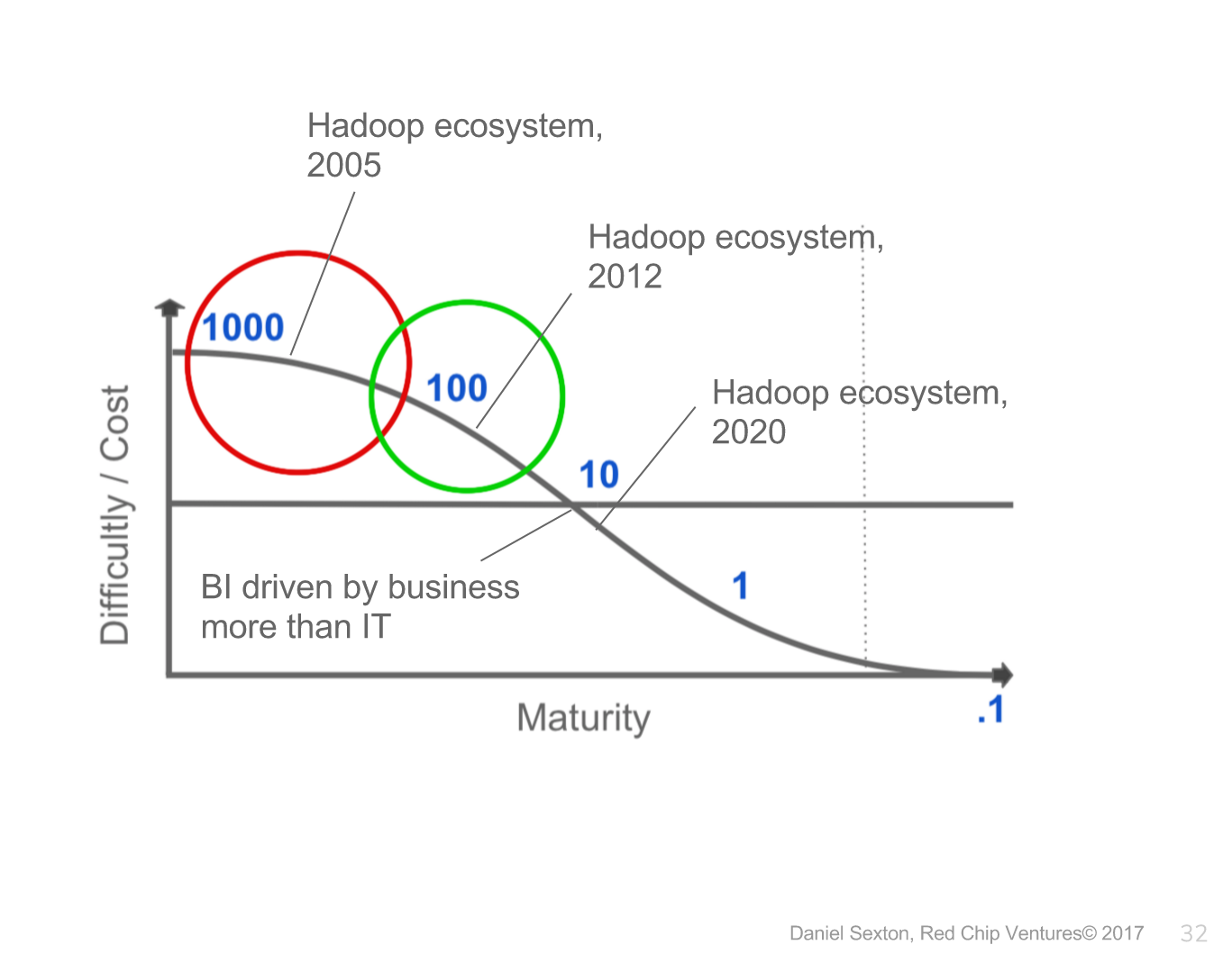 The complexity and cost of the project tend to decrease exponentially as value chains commoditize. A common mistake I saw in vetting startup pitches for a few years was with founders attempting to build projects with new technologies too early. Adopting too early is extremely expensive. (see 99% of Blockchain Startups are BS) The competitors who time entry just right face surmountable costs while engaging in a market where customers can be won.